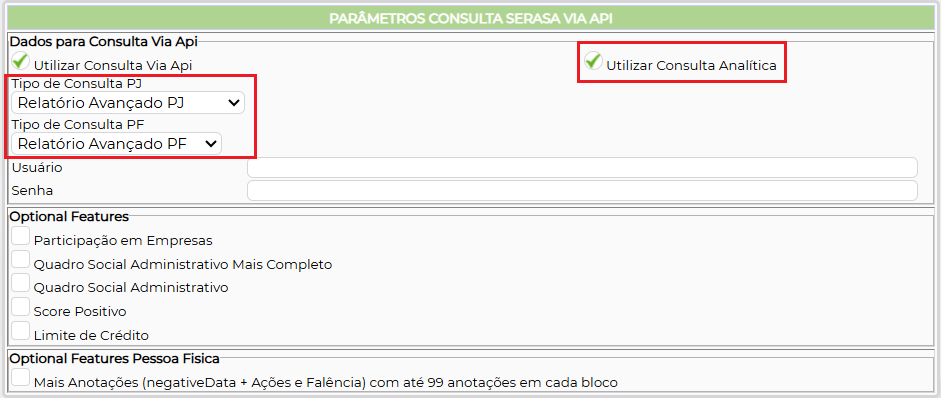 É necessário configurar o tipo de consulta que você possui contratado junto ao Serasa. Se a sua consulta for analítica deve ser marcada a opção ‘Utilizar Consulta Analítica’, independente do tipo de consulta contratado.